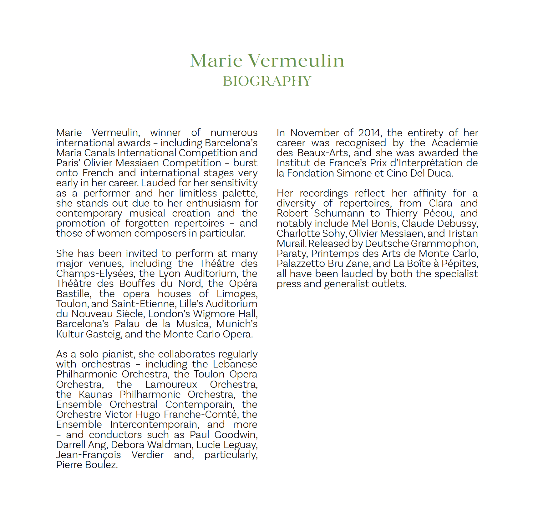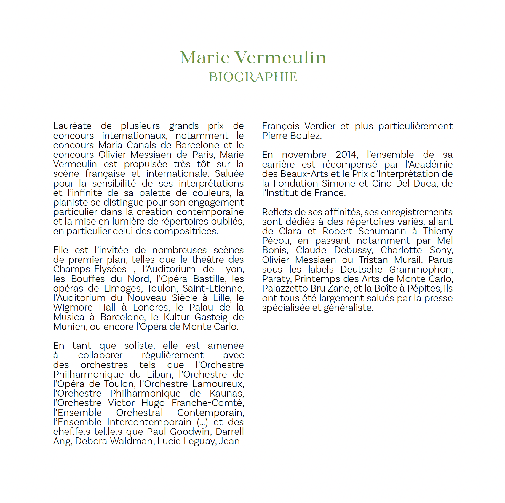 Lauréate de plusieurs grands prix de concours internationaux, notamment le concours Maria Canals de Barcelone et le concours Olivier Messiaen de Paris, Marie Vermeulin est propulsée très tôt sur la scène française et internationale. Saluée pour la sensibilité de ses interprétations et l’infinité de sa palette de couleurs, la pianiste se distingue pour son engagement particulier dans la création contemporaine et la mise en lumière de répertoires oubliés, en particulier celui des compositrices. Elle est l’invitée de nombreuses scènes de premier plan, telles que le théâtre des Champs- Elysées, l’Auditorium de Lyon, les Bouffes du Nord, l’Opéra Bastille, les opéras de Limoges, Toulon, Saint-Etienne, l’Auditorium du Nouveau Siècle à Lille, le Wigmore Hall à Londres, le Palau de la Musica à Barcelone, le Kultur Gasteig de Munich, ou encore l’Opéra de Monte Carlo. En tant que soliste, elle est amenée à collaborer régulièrement avec des orchestres tels que l’Orchestre Philharmonique du Liban, l’Orchestre de l’Opéra de Toulon, l’Orchestre Lamoureux, l’Orchestre Philharmonique de Kaunas, l’Orchestre Victor Hugo Franche-Comté, l’Ensemble Orchestral Contemporain, l’Ensemble Intercontemporain (…) et des chef.fe.s tel.le.s que Paul Goodwin, Darrell Ang, Debora Waldman, Lucie Leguay, Jean-François Verdier et plus particulièrement Pierre Boulez. En novembre 2014, l’ensemble de sa carrière est récompensé par l’Académie des Beaux-Arts et le Prix d’Interprétation de la Fondation Simone et Cino Del Duca, de l’Institut de France. Reflets de ses affinités, ses enregistrements sont dédiés à des répertoires variés, allant de Clara et Robert Schumann à Thierry Pécou, en passant notamment par Mel Bonis, Claude Debussy, Charlotte Sohy, Olivier Messiaen ou Tristan Murail. Parus sous les labels Deutsche Grammophon, Paraty, Printemps des Arts de Monte Carlo, Palazzetto Bru Zane, et la Boîte à Pépites, ils ont tous été largement salués par la presse spécialisée et généraliste.