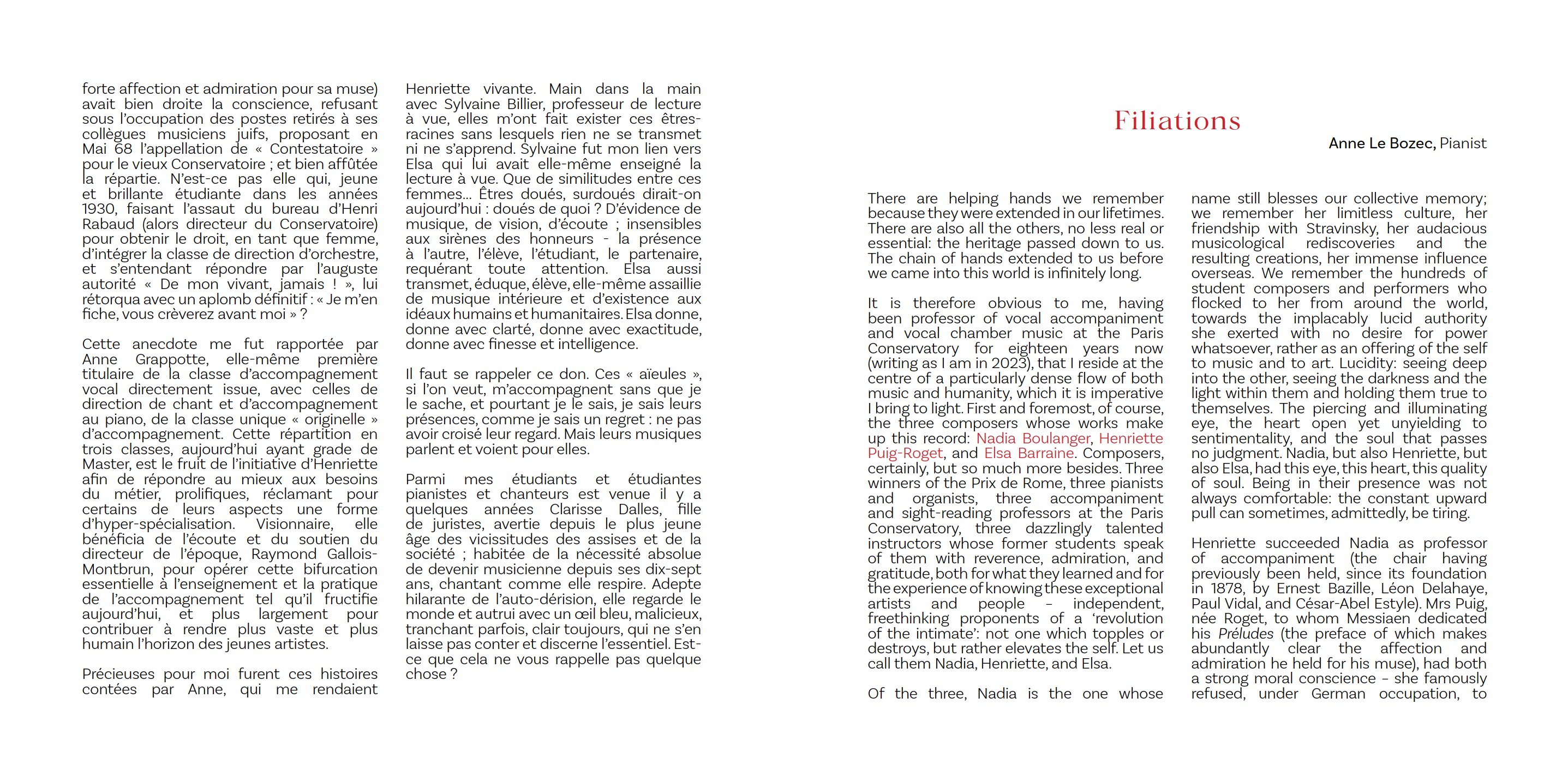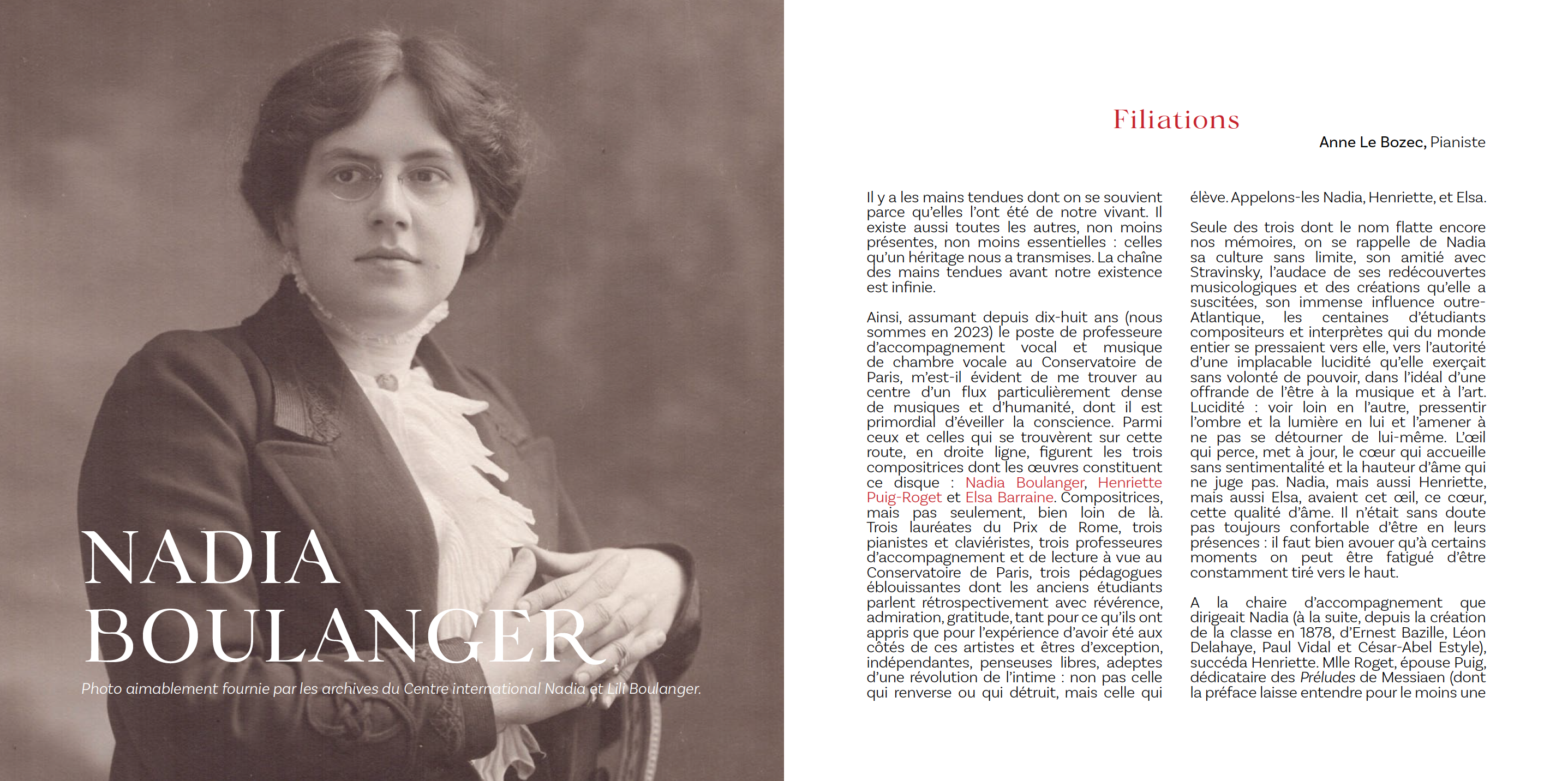 Née au sein d’une famille éprise d’art, Anne Le Bozec vient dès sa prime enfance à un large éveil créatif : musique, mais aussi dessin, littérature et poésie l’accompagnent en permanence. Son intérêt premier pour une pluralité de formes artistiques se retrouve dans le parcours qu’Anne Le Bozec effectue aujourd’hui au concert et en tant que pédagogue.