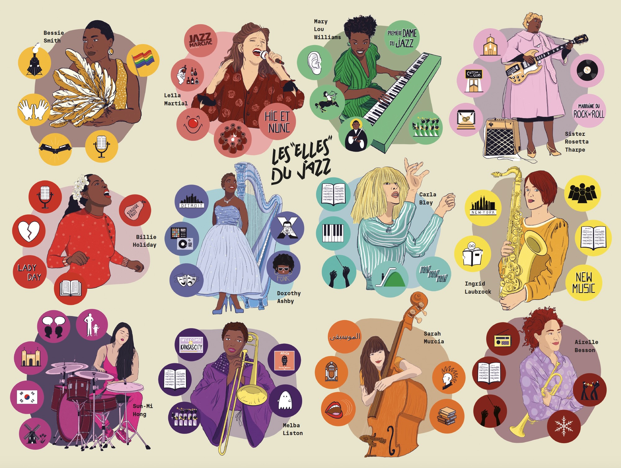 L’histoire du jazz, comme toutes les autres, s’est écrite au masculin. Or, il a toujours existé des femmes, instrumentistes, chanteuses ou compositrices, qui ont apporté leurs plumes aux ailes du jazz. Parce que nous devions être volontaristes dans notre engagement en faveur de la valorisation des femmes artistes, l’ONJ a mis en place un projet de médiation destiné aux adolescent.e.s de 13 à 17 ans mais qui s’ouvre également à tous les public : Les Elles du Jazz.